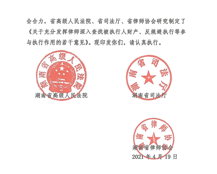近日,湖南省高级人民法院、省司法厅、省律师协会联合出台《关于充分发挥律师深入查找被执行人财产、反规避执行等参与执行作用的意见》(以下简称《意见》),提出19条措施,积极引入律师专业力量参与执行、辅助执行,推动形成解决执行难的社会合力。